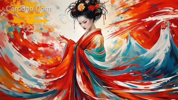 Abstract art, impressionist technique, a court lady offering flowers, in the style of Fuji.