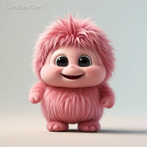 A cute little pink monster with a fluffy texture, covered in soft, long fur all over its body, revealing two round eyes. It has a chubby, round shape without a neck, appearing sweet and adorable. The image is a 3D render, full-body shot, captured in natural lighting.
