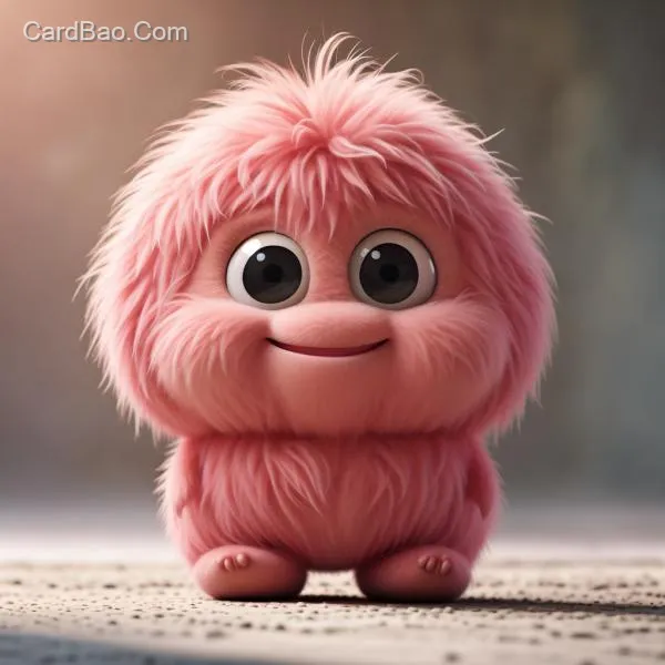 A cute little pink monster with a fluffy texture, covered in soft, long fur, revealing two eyes. It has a round, chubby body with no visible neck, appearing sweet and adorable. 3D rendered, full-body shot, natural lighting.