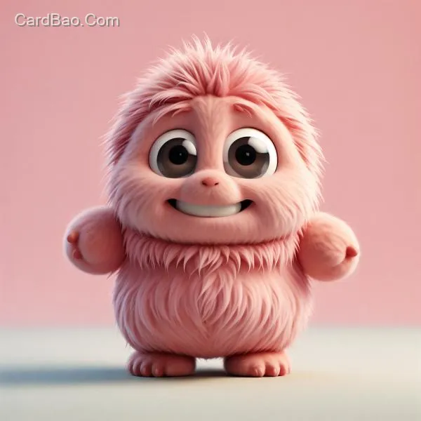 A cute little pink monster with a fluffy texture, covered in soft, long fur, revealing two round eyes. It has a chubby, round body without a neck, appearing sweet and adorable. The image is a 3D render, full-body shot, captured in natural lighting.