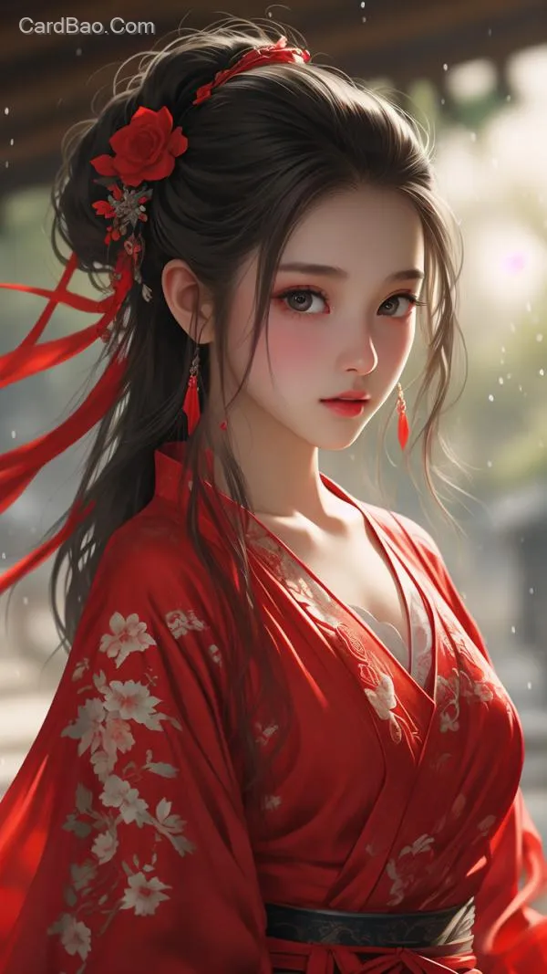 微距摄影,日漫风,皮肤白皙,大眼睛,古风美女,红色汉服,轮廓光线,大眼睛,优雅武侠风,飘逸,复杂的细节,绝美,完成度高,细节丰富,质感细腻,视觉冲击力强,超细节,高分辨率,高饱和度,光线追踪,光影特效,8K