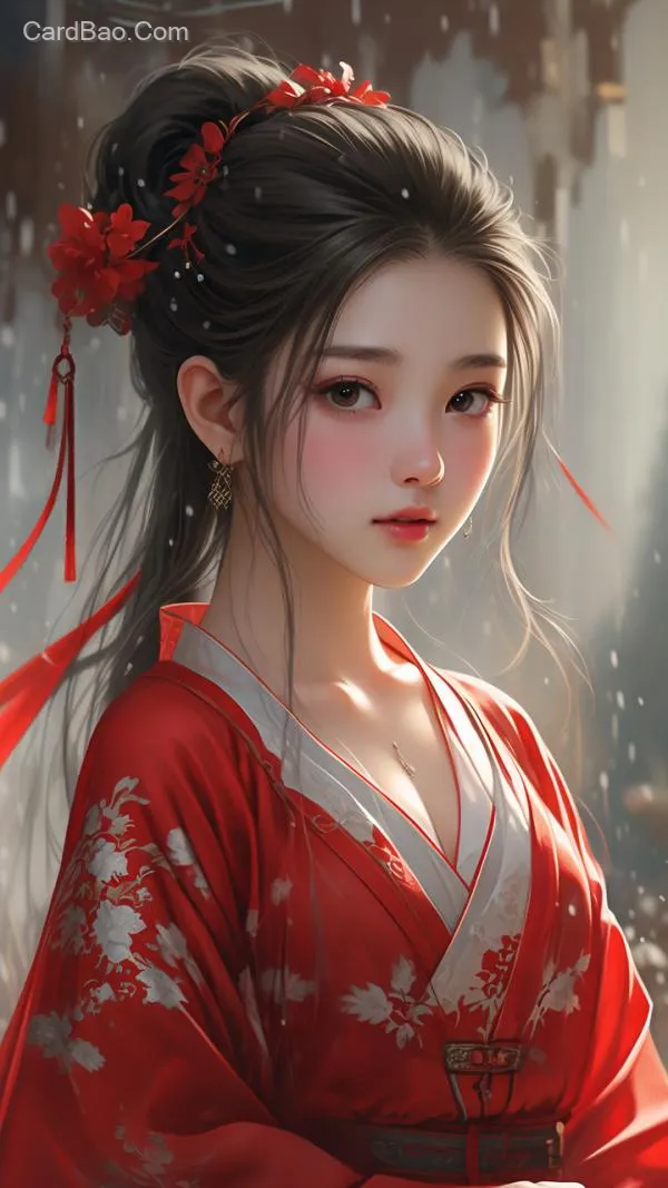 微距摄影,日漫风,皮肤白皙,大眼睛,古风美女,红色汉服,轮廓光线,大眼睛,优雅武侠风,飘逸,复杂的细节,绝美,完成度高,细节丰富,质感细腻,视觉冲击力强,超细节,高分辨率,高饱和度,光线追踪,光影特效,8K