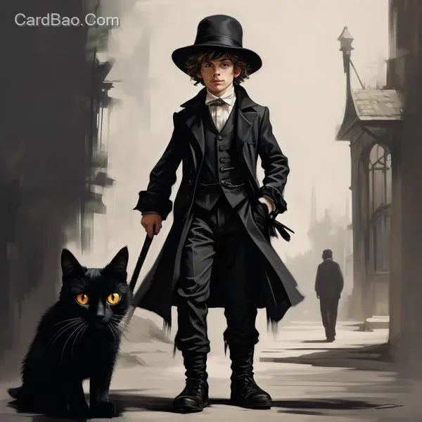 Full body, subtle brush strokes, black silhouette of a person, dark background, lines, young European man, handsome, reddish-brown eyes, black long coat, holding a cane, with a black cat with yellow eyes at his feet.