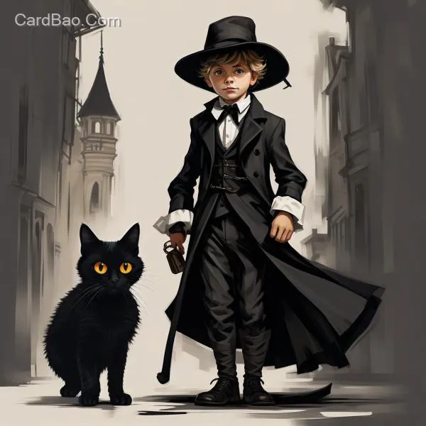 Full body, subtle brush strokes, black silhouette of a person, dark background, lines, young European man, handsome, reddish-brown eyes, black long coat, holding a cane, with a black cat with yellow eyes at his feet.