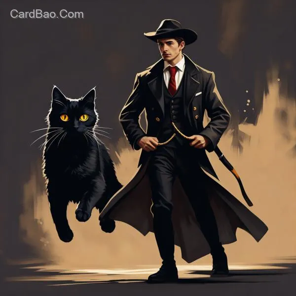 Hand-drawn illustration style, full body, subtle brushstrokes, black silhouette of a character, dark background, line art, young European man, handsome, reddish-brown eyes, wearing a long black suit, holding a cane, a black cat with yellow eyes at his feet, a battle-ready scene, sense of interaction.