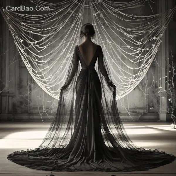 A European or American woman in a long gown, with her back turned, entangled in spider silk, indoors.