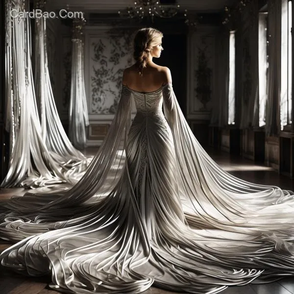A European or American woman in a long robe, with silver threads entwined, indoors, viewed from the back.
