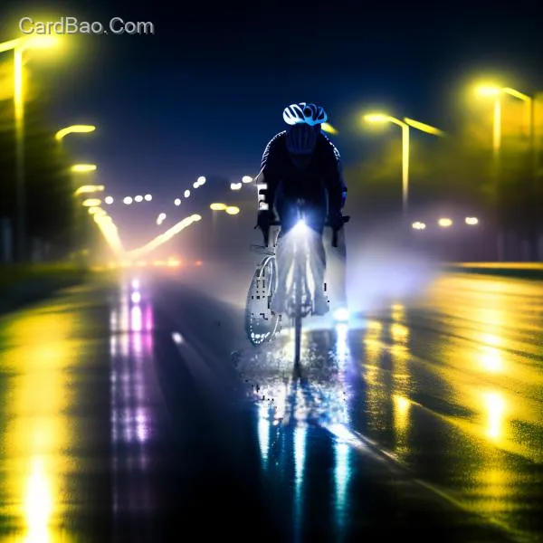 At night, a cyclist is riding a mountain bike, with the bike light turned on. The light is very bright and is coming toward me head-on. It feels realistic, with excellent lighting effects from the bike light in the night setting.