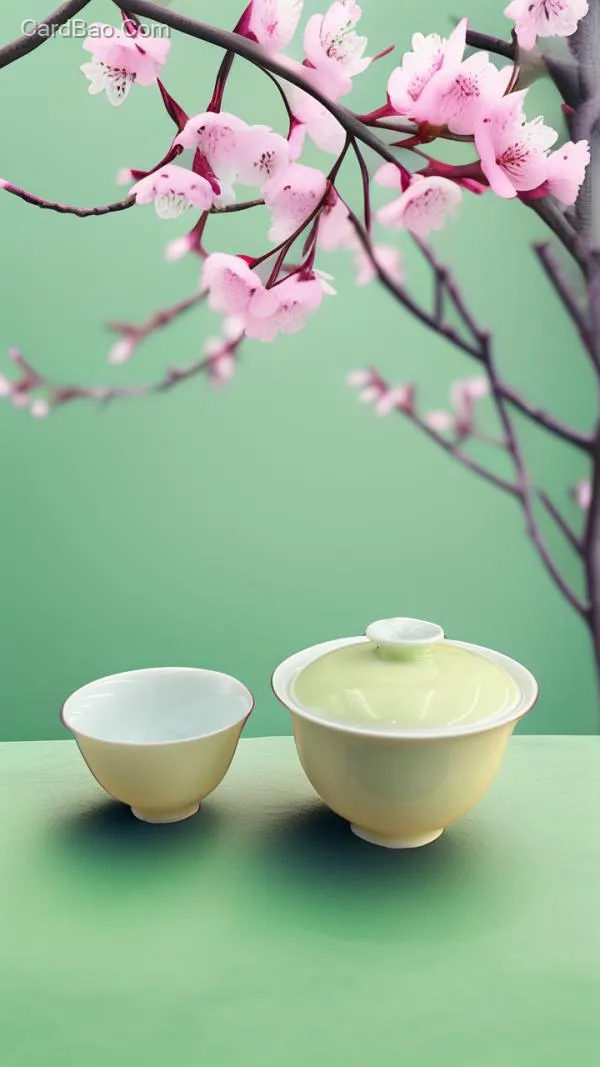 Light green textured background, tea tree, tea leaves, spring, modern feel.