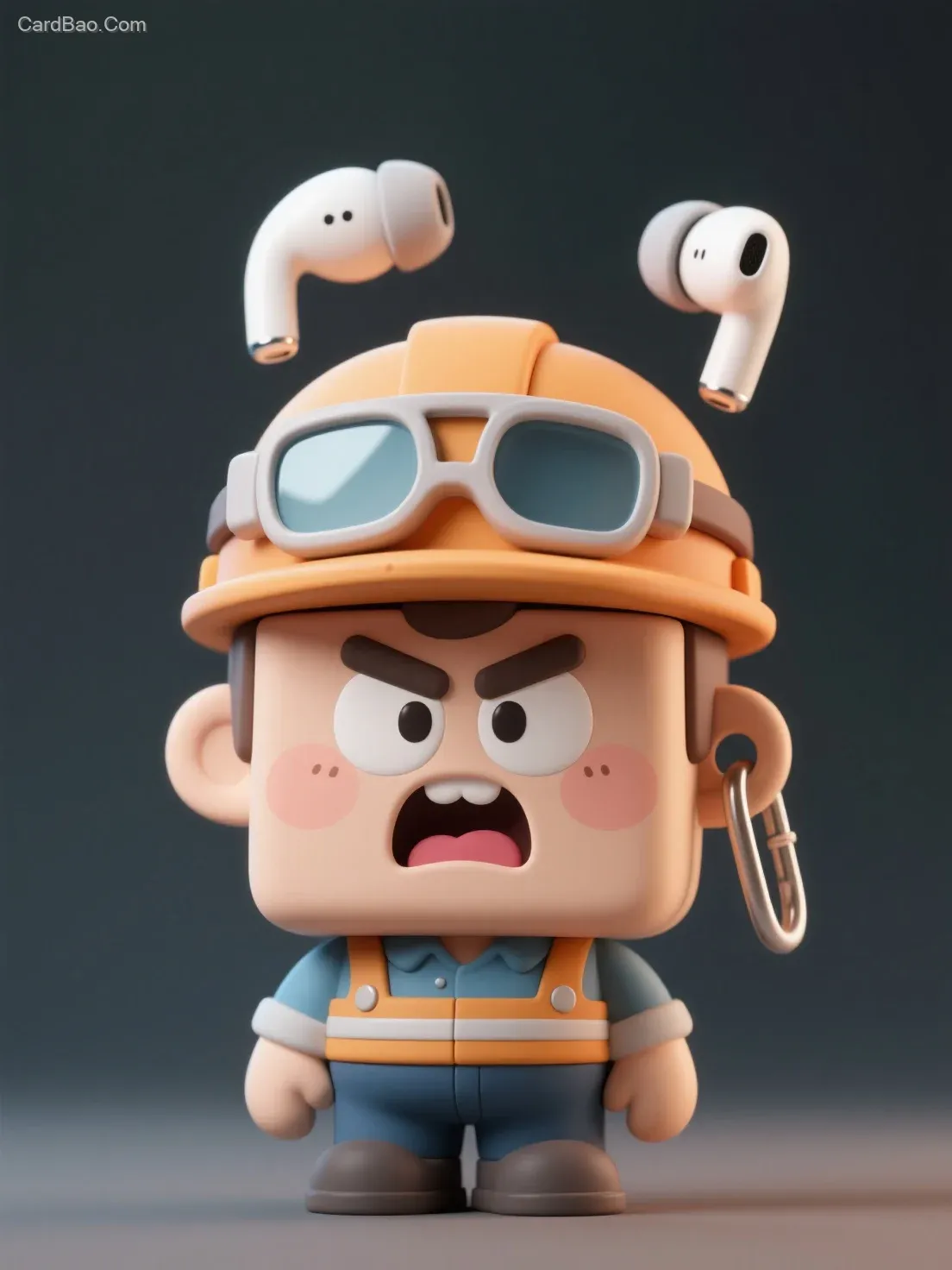工业设计,产品设计,生成一个AirPods耳机保护套,卡通工人角色,角色表情夸张,方脸,丑萌,戴着工人帽,工人帽子上面有护目镜。c4d风格,高清渲染。