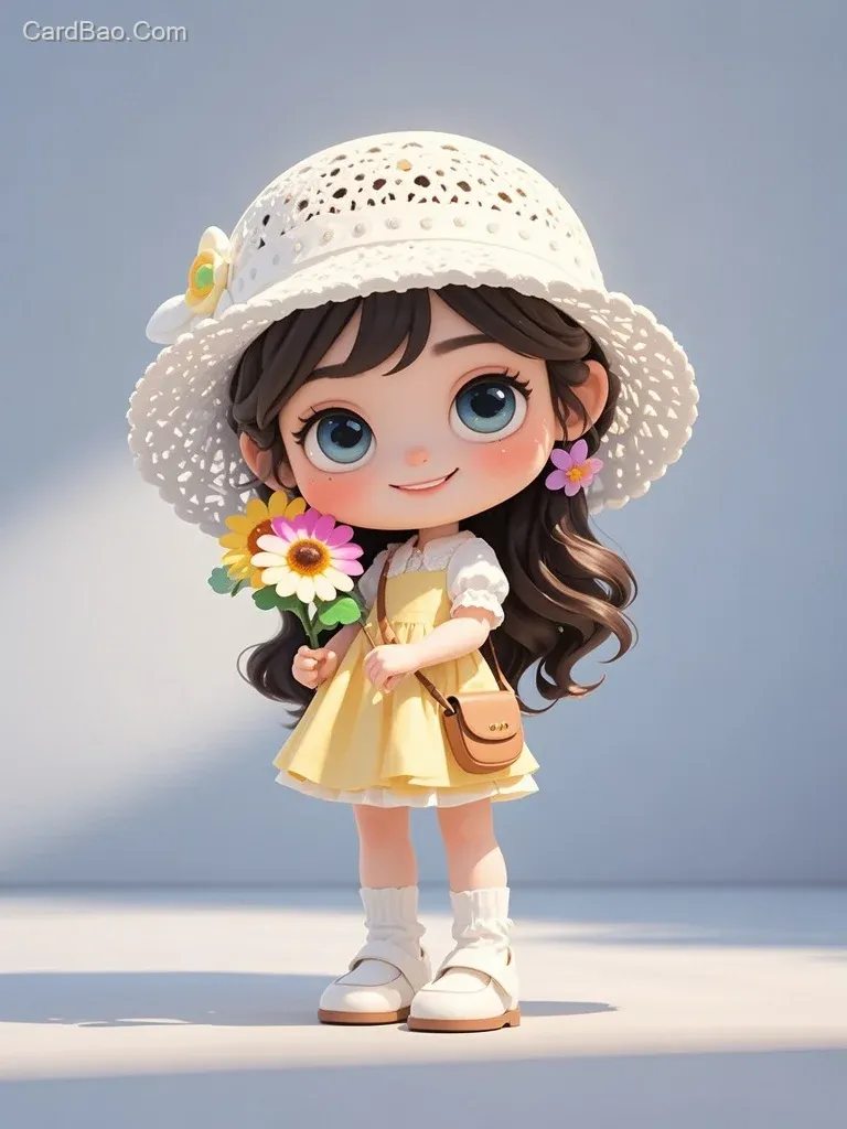 Q-version modern comic style, clever and adorably naive, cute Chinese girl, with a three-dimensional face, a large head, always smiling, big eyes, long curly hair wearing a white lace summer hat, a cream-colored dress, white shoes, full body, single-color background, natural lighting, porcelain-like skin, pupils catching the light, holding a seven-colored sunflower, backlit, medium shot, reflective, super cute, minimalist drawing style, carrying a bag while shopping.