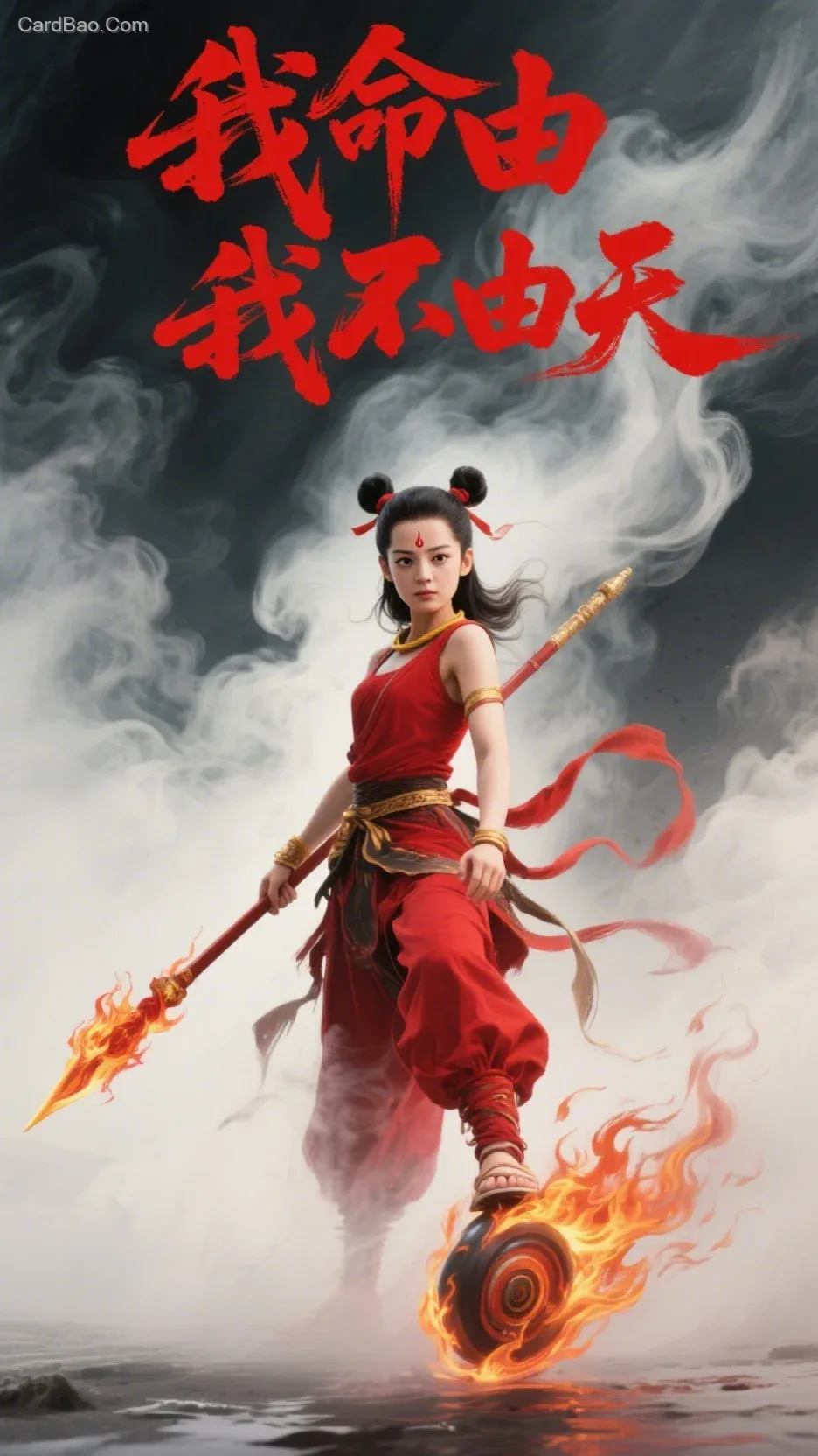 An ink wash painting of a smoke-formed version of Dilraba as Nezha, with the theme "I am the master of my fate, not the heavens."