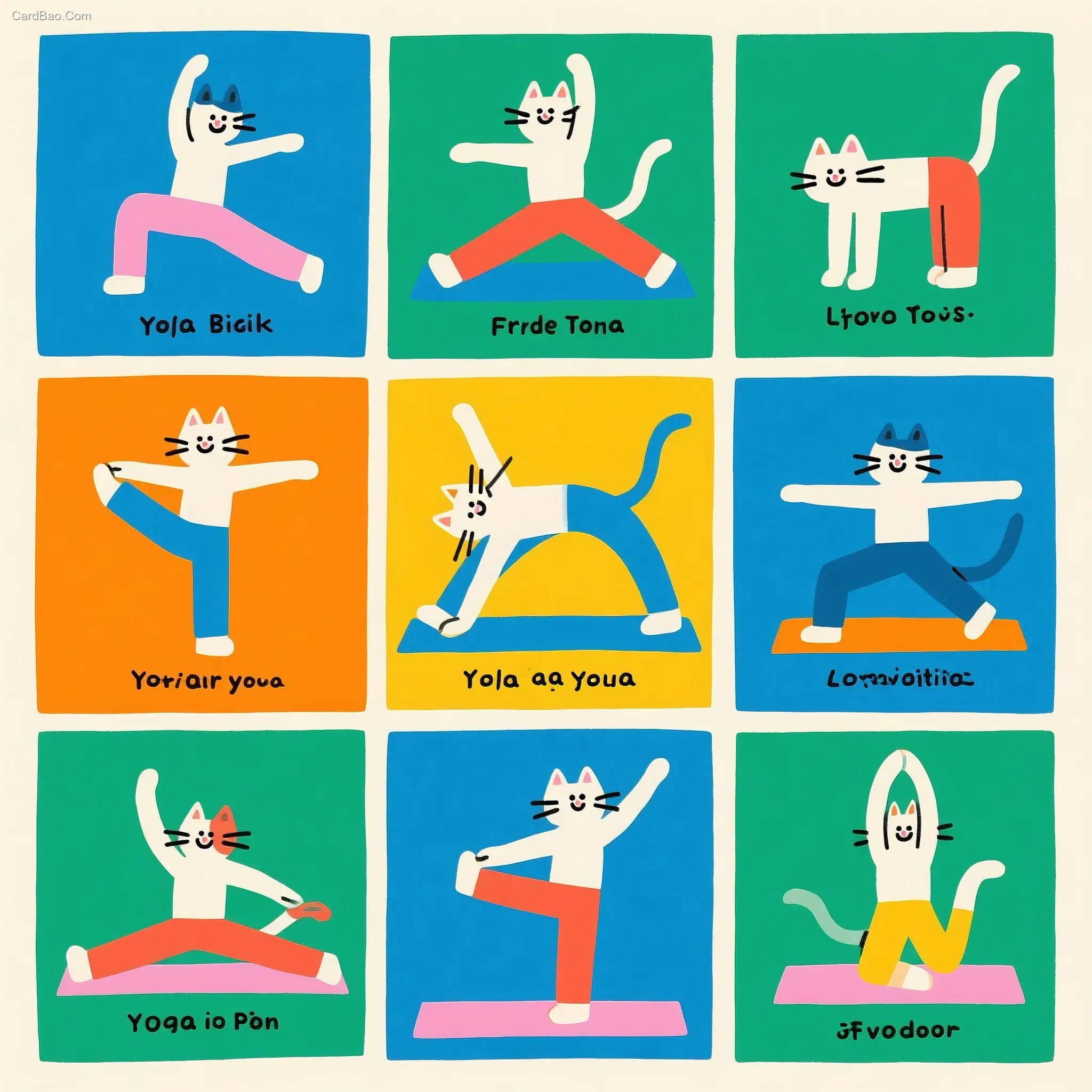 宫格插画,做瑜伽的小猫,小猫腿很长,拟人化小猫,以宫格形式展示经典瑜伽操动作,九宫格布局,画面上可添加瑜伽动作对应的文字说明。