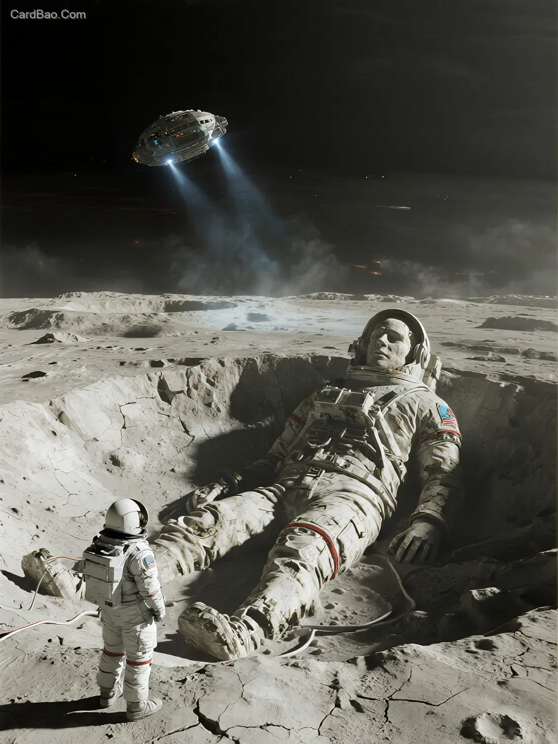 A massive lunar crater holds a damaged giant statue lying within. An astronaut stands beside the giant, viewed from a low angle, emphasizing the desolate and misty environment. The scene evokes a dreamlike, stream-of-consciousness atmosphere, captured with backlighting and swirling dust. Cracks in the statue emit light, while a distant spaceship descends in the background.