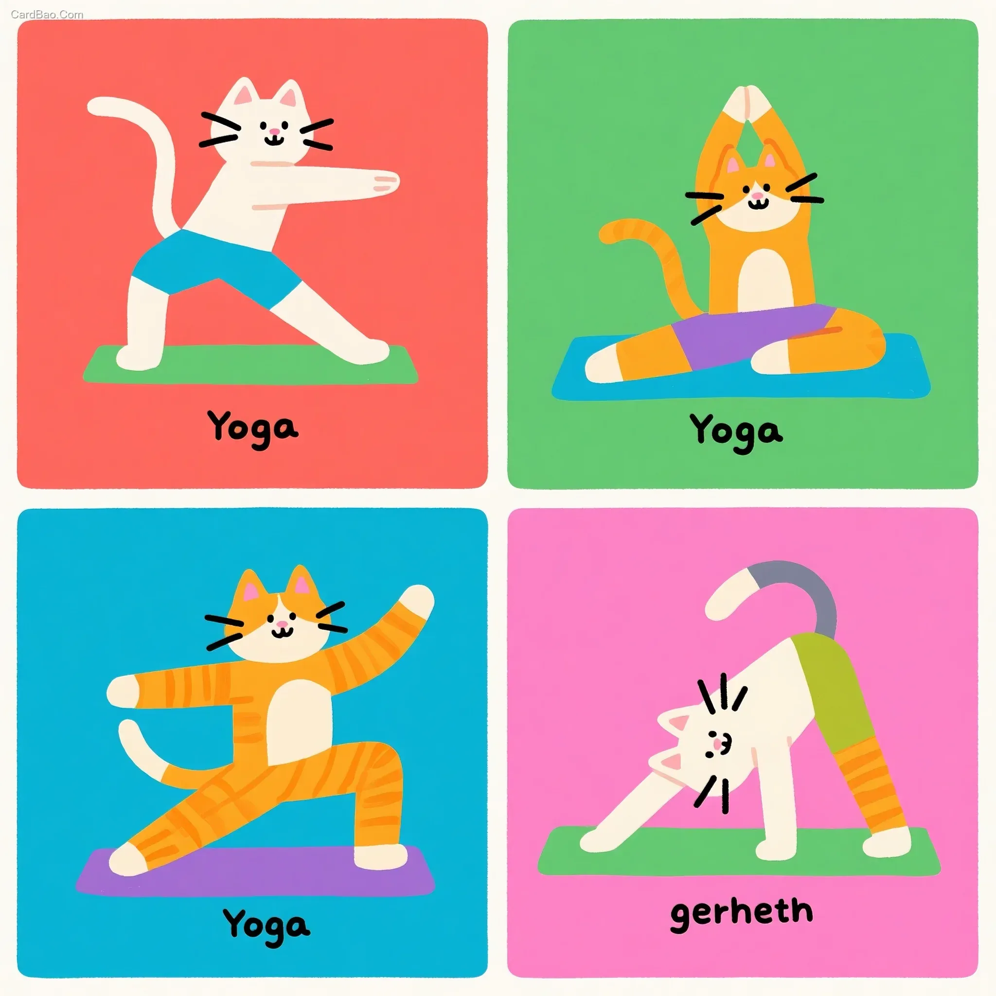 宫格插画,做瑜伽的小猫,小猫腿很长,拟人化小猫,以宫格形式展示经典瑜伽操动作,4乘以4宫格布局,画面上可添加瑜伽动作对应的文字说明。