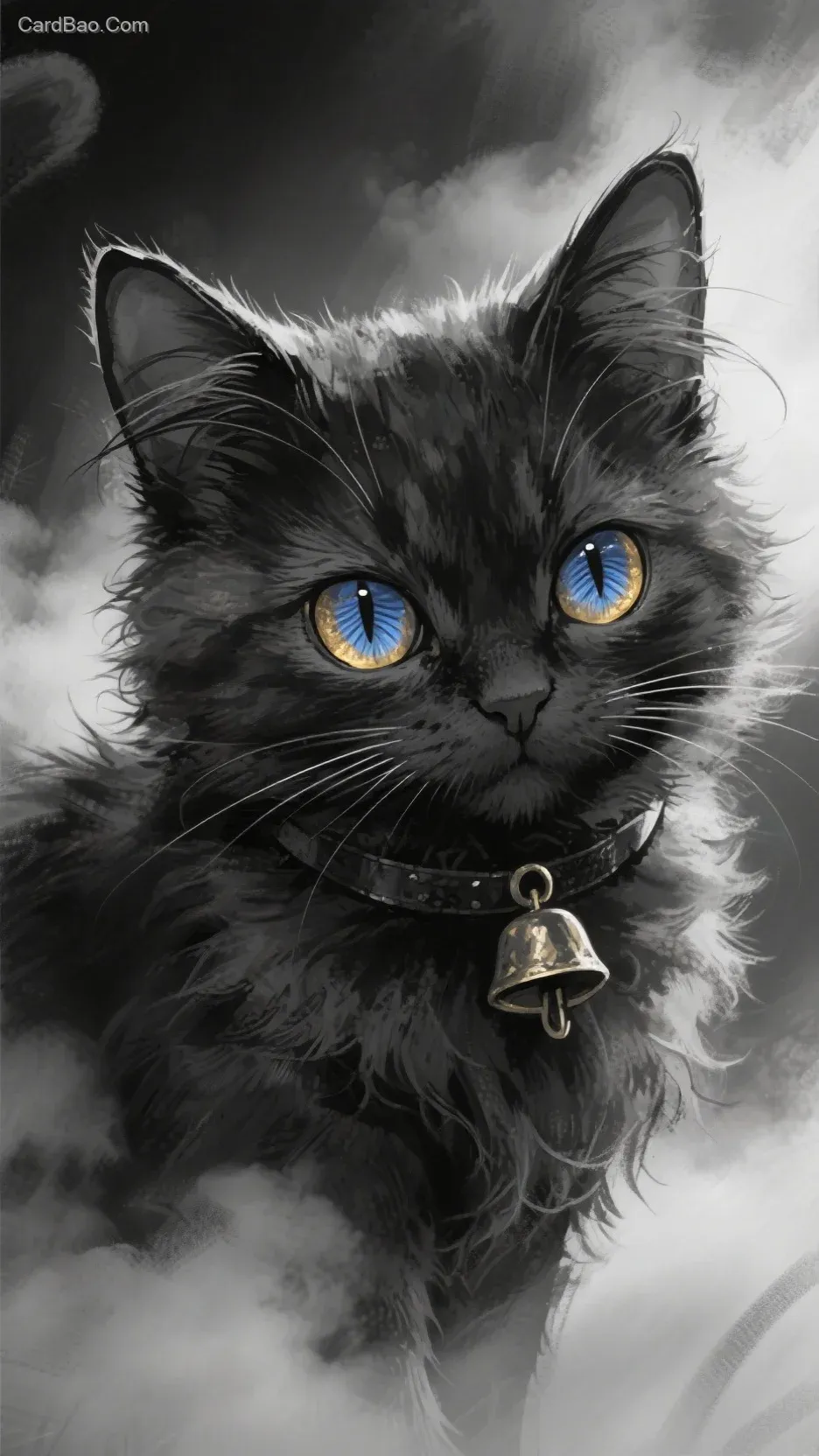 暗黑油画风,动漫特写,毛茸茸的小猫,蓝金猫瞳,虹膜竖纹,虹膜反光,俯视镜头,虚化景深,磨砂皮膜,发丝枯槁,铃铛项圈,黑白滤镜,云雾光晕,腐朽权威。