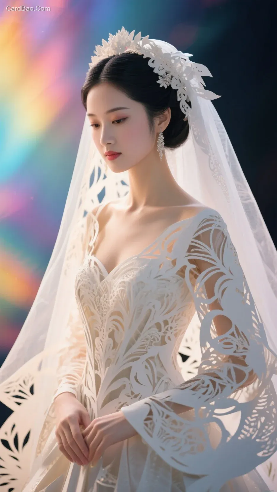 剪纸艺术,中国美女,婚纱,由剪纸渐变成真人,幻彩背景,创新设计,超现实主义,细致逼真,層次丰富,完美光影,大師作品