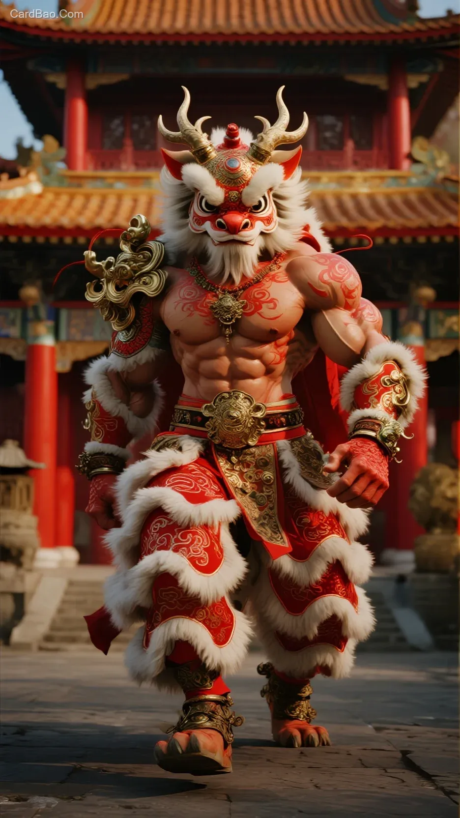 健硕肌肉龙狮结合神兽,龙的犄角,迎面走来,身上皮毛厚重,身上有红色虚拟国潮纹,身形巨大,写实,东方色彩,金属质感配饰,动态自然,电影构图,光影效果