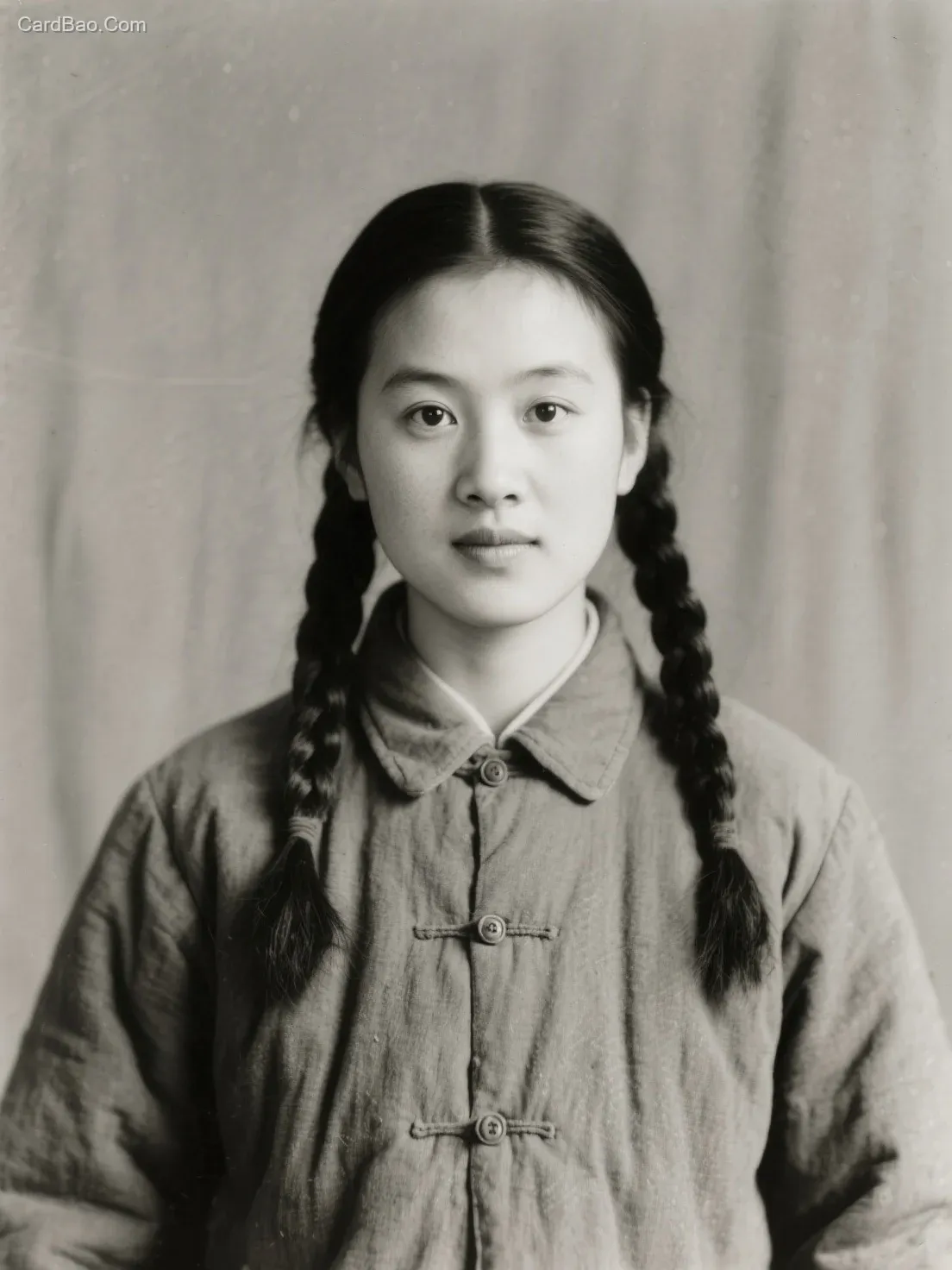 A retro black and white 1-inch portrait photo, featuring a close-up of the upper body of a young woman. She has two braids hanging in front of her chest and is wearing an old cotton-padded jacket with wide lapels (the collar is naturally folded, the fabric shows a thick texture, the front buttons are neatly arranged, and it is not a diagonal closure design). Her posture is upright in a traditional photographic pose, with a gentle facial expression and eyes looking directly at the camera. The background is a plain gray backdrop, with soft and even lighting, showcasing the characteristic grain and noise of old photographs, preserving the portrait quality of the film era.