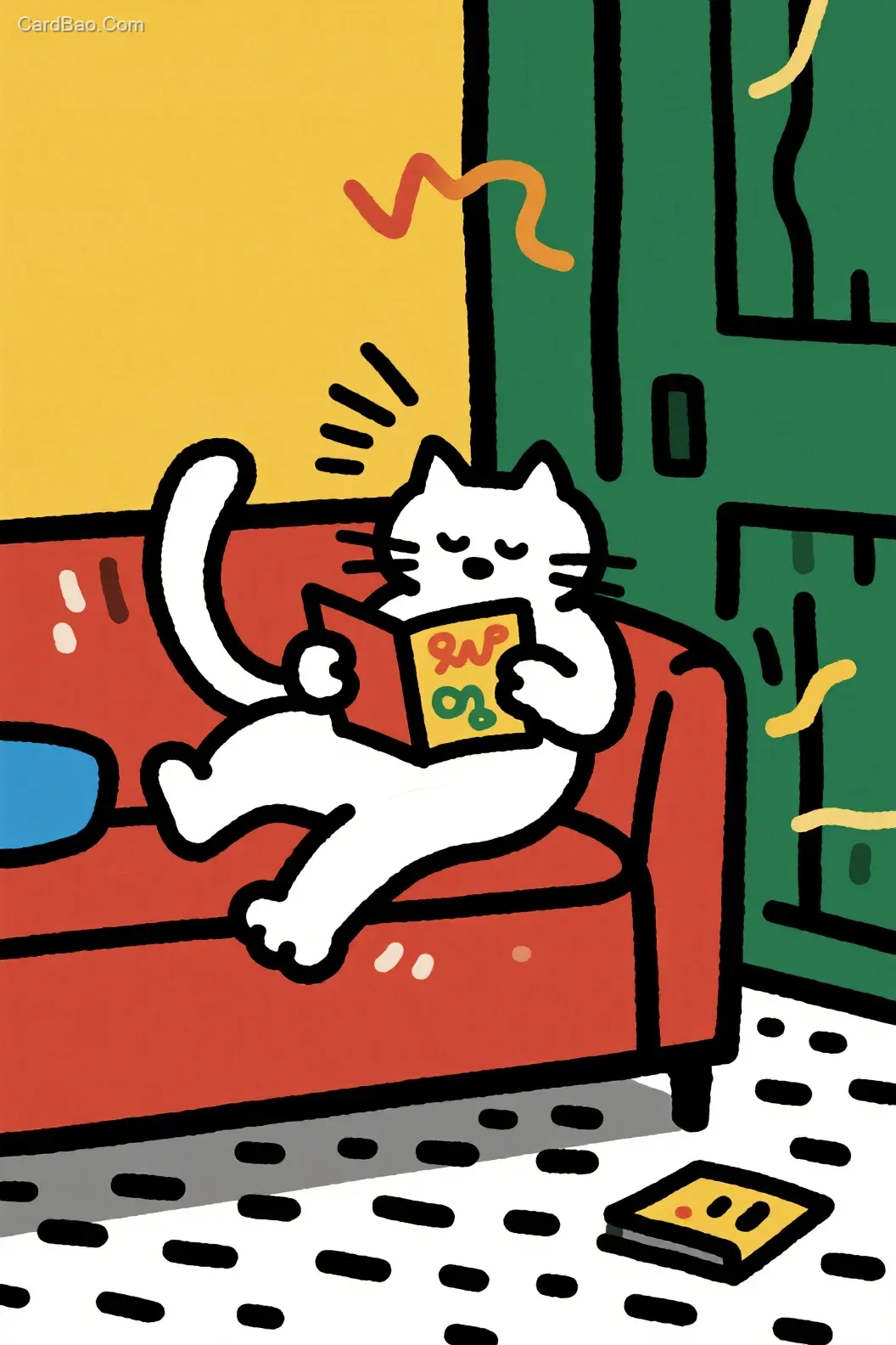 A hand-drawn white cat lies on a couch reading a book, in Keith Haring's vibrant graffiti style — bold black outlines, bright flat colors, and playful doodle energy. Minimalist living room background with dynamic lines