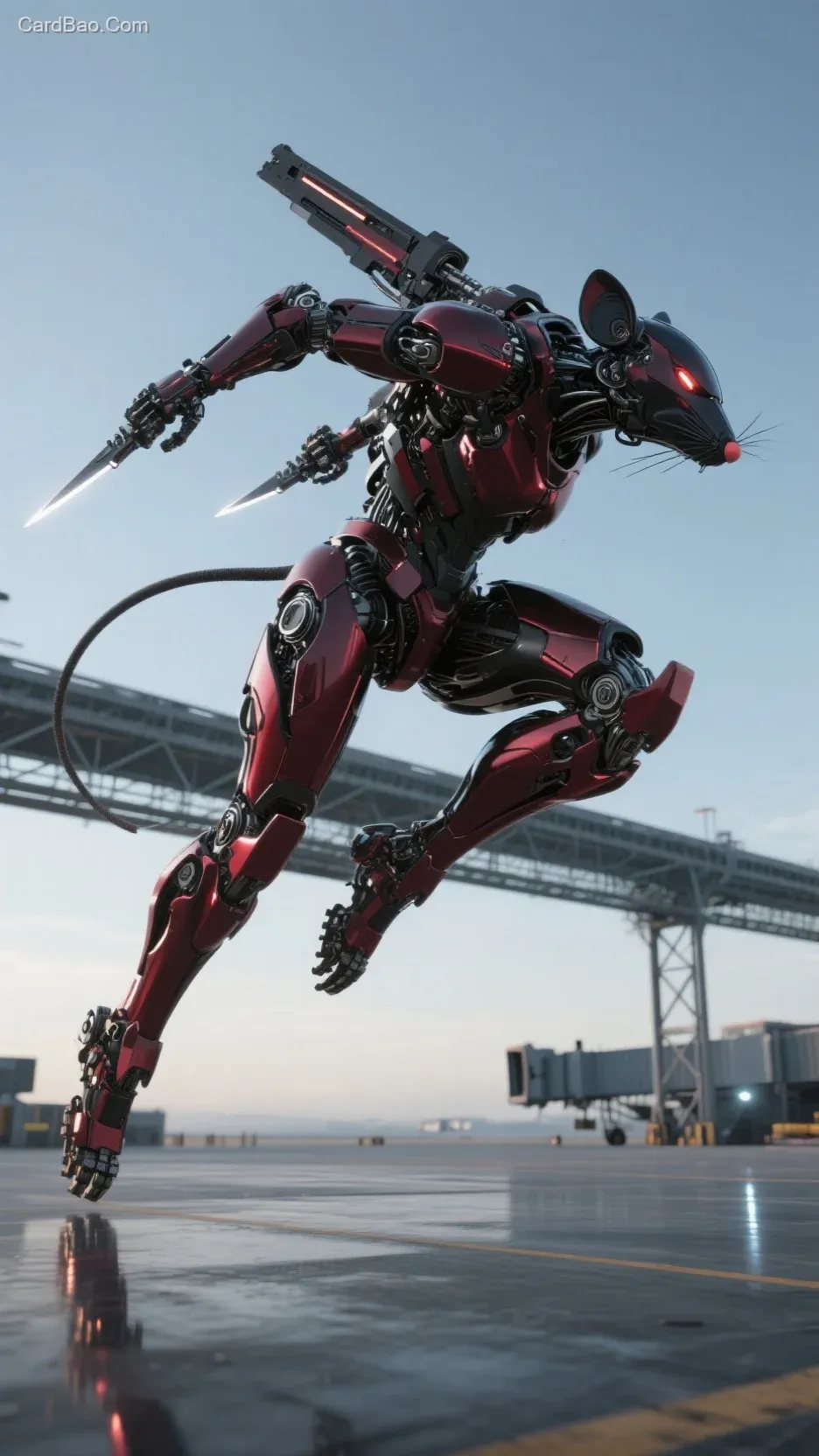 Super Mechanical Civilization Silicon-Based Life Form, Stealth Assassin Mecha, Shadow Rat Hunter, streamlined in motion, dynamically capturing attacking postures, armed with stabbing hand blades, matte dark black and red color scheme, intricate mechanical structure, aerodynamic and dynamic, set against a vast, flat metallic airport background, with pulsed light reflections, metallic texture, 3D rendering, OC rendering, low-angle view, low-angle shot, leaping assault, realistic natural lighting and shadows, 8K ultra-high resolution.
