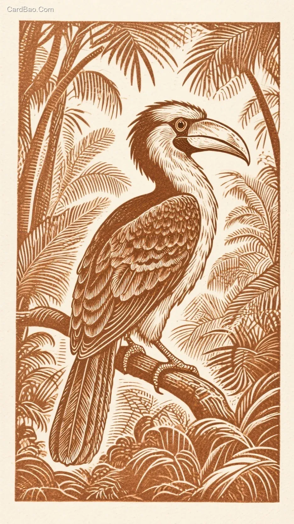 A jungle-enveloped hornbill line engraving, outlined with 0.8mm bold lines, detailed with 0.2mm fine lines for surface feathers, retaining copperplate engraving marks, in brown tones, set against a tropical jungle background.