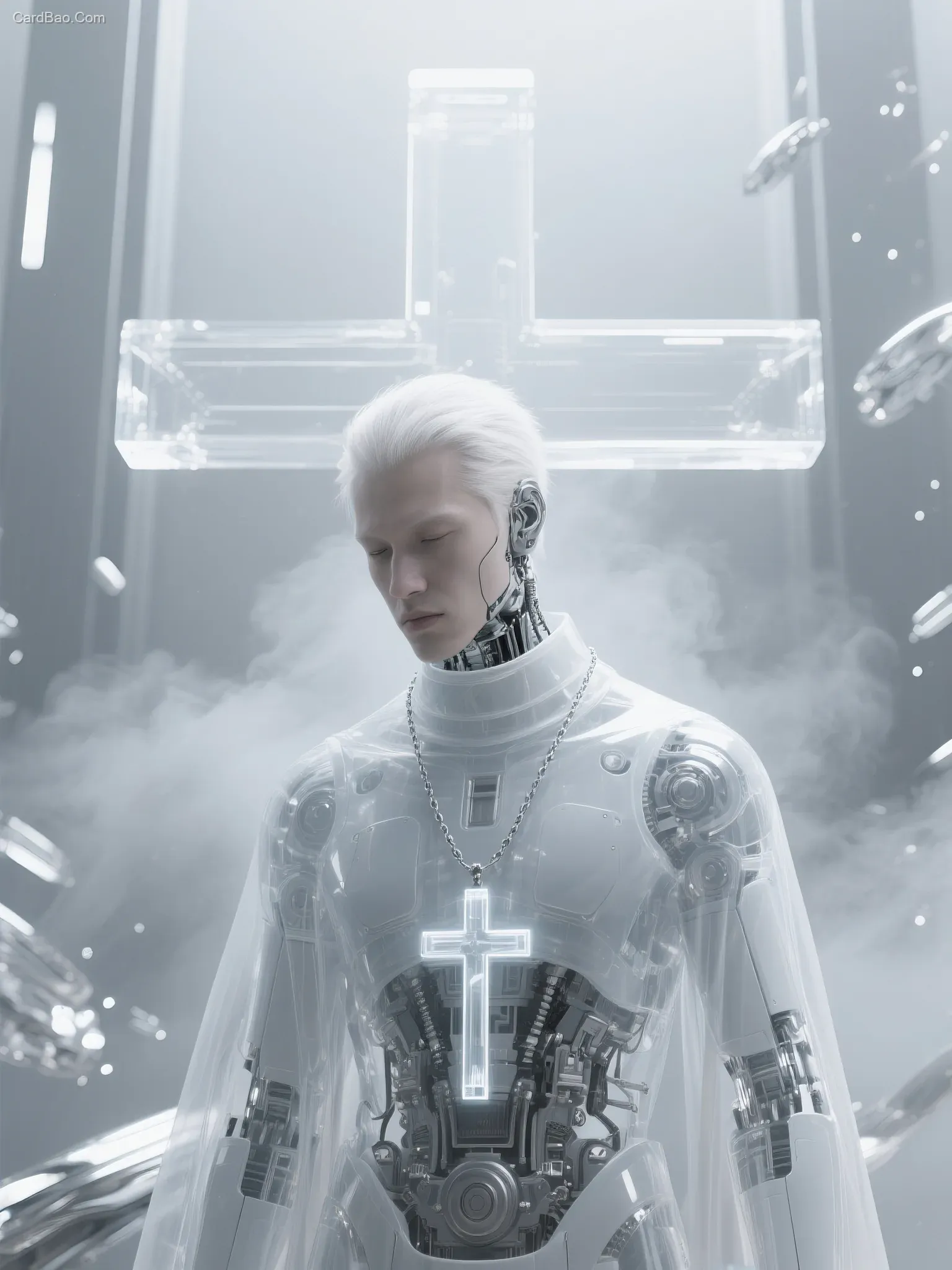 Semi-mechanical, semi-skin ultra-transparent texture, with visible mechanical components inside the transparent parts. A white-haired mechanical preacher with highly realistic skin details, wearing a transparent mechanical cross necklace on the chest, exuding a sci-fi and mystical aura. Behind, a massive transparent cross stands upright. The background is grand and ash-white, filled with a futuristic atmosphere and a mysterious, smoke-filled ambiance. Silver light particles radiate all around. Master-level cinematography, 6K ultra-high-definition sampling.
