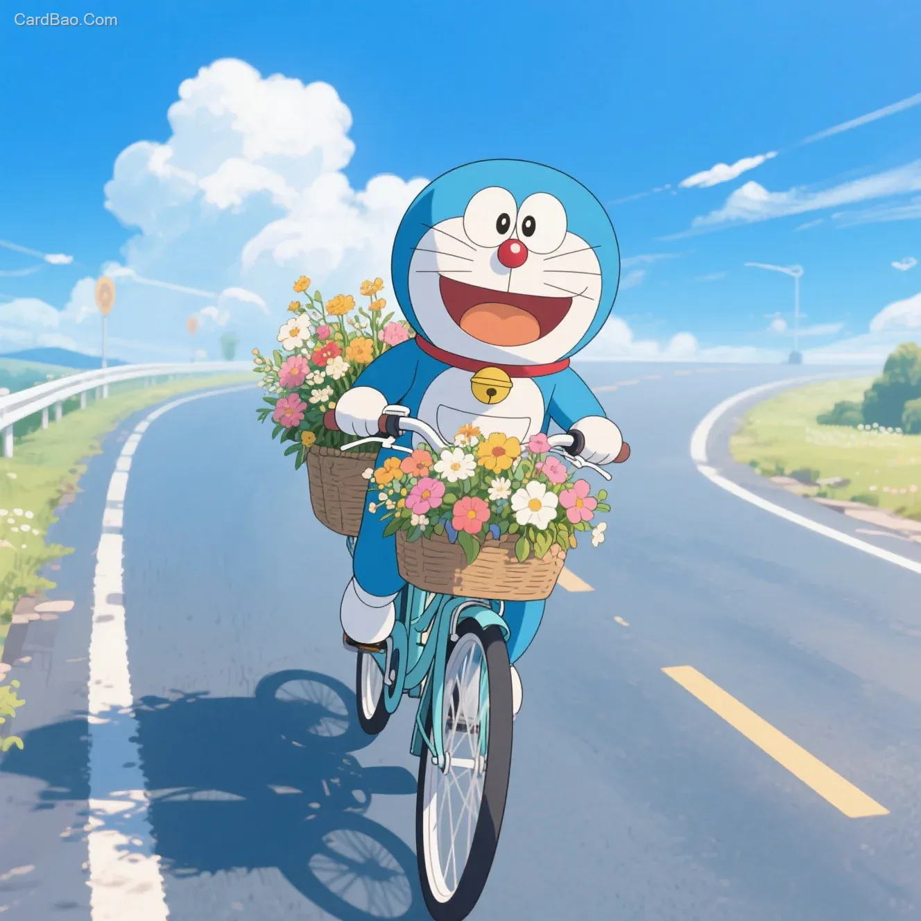 Doraemon riding a bicycle filled with flowers, on a sky-blue road, anime style, panoramic, warm, fresh
