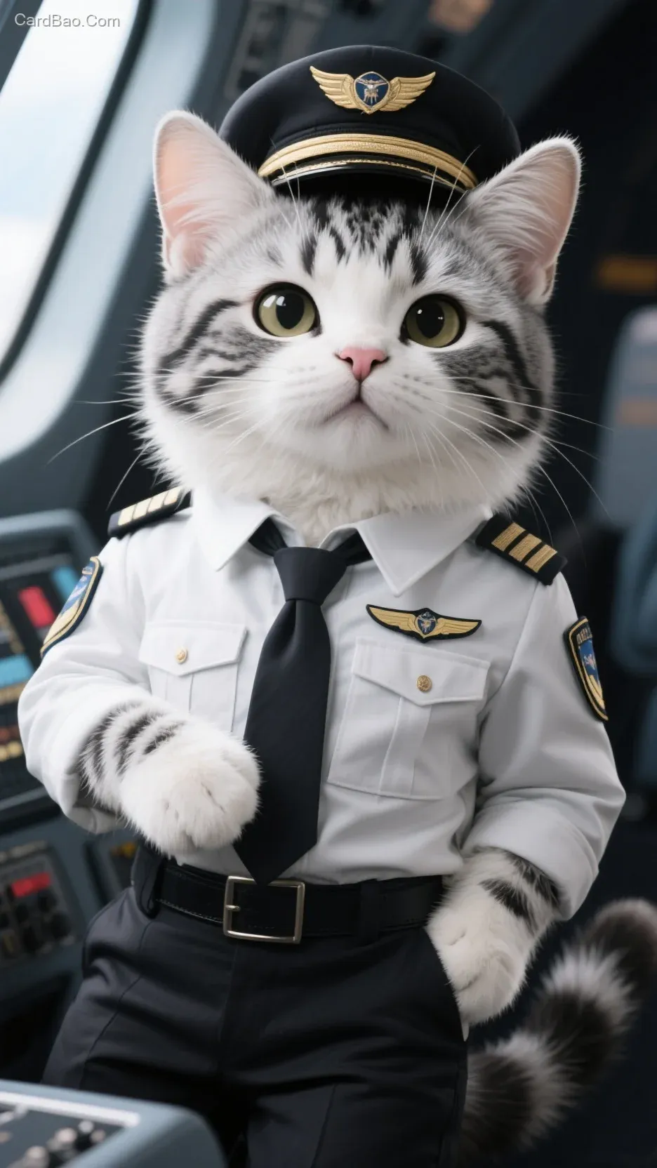 拟人美短起司猫咪。黑白灰的毛发。全身毛茸茸的。拟人美短起司猫咪穿着航空机长的衣服。