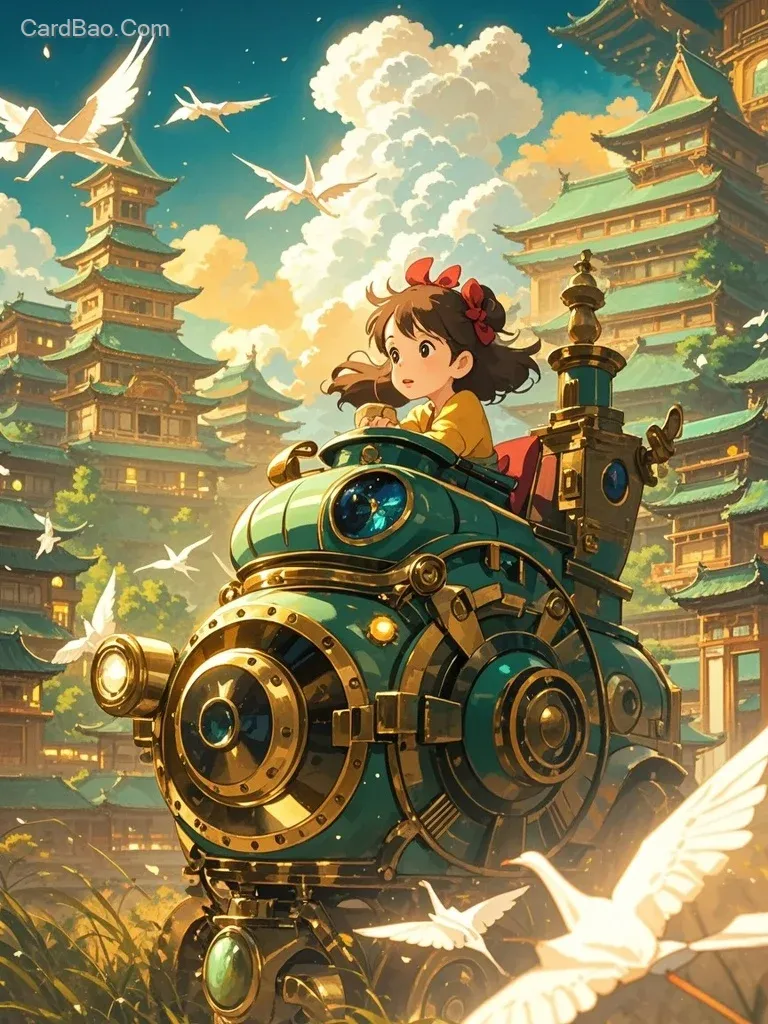 获奖作品,美学,极致光影,吉卜力风格,动态感动漫风格,一个小女孩坐着时光机穿越的画面,看到了古代的宋朝,创意有趣