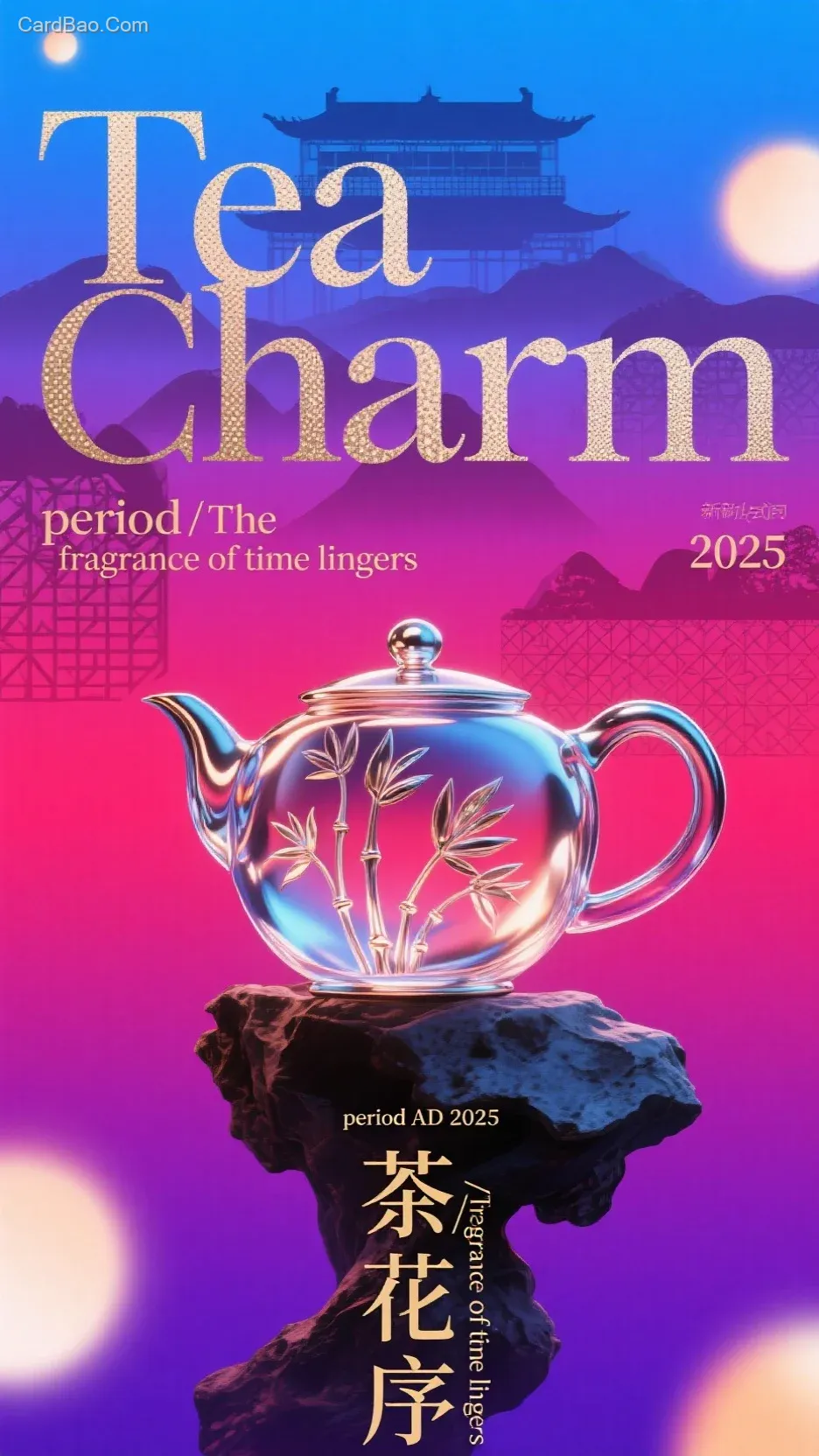 放大茶壶主体流淌液态金属光泽,竹叶脉络采用透明流体技法重构,背景层叠宋代山水建筑剪影与几何花纹,"period AD 2025"以噪点笔触嵌入太湖石表面,新中式商业海报,高饱和渐变背景从青蓝向紫红过渡,细枝叶采用工笔白描手法,主标题"Tea Charm"使用立体镀铬字体居中,底部双行文字"茶花序/The fragrance of time lingers"采用竖排烫金设计,酸性色系光斑点缀画面四角