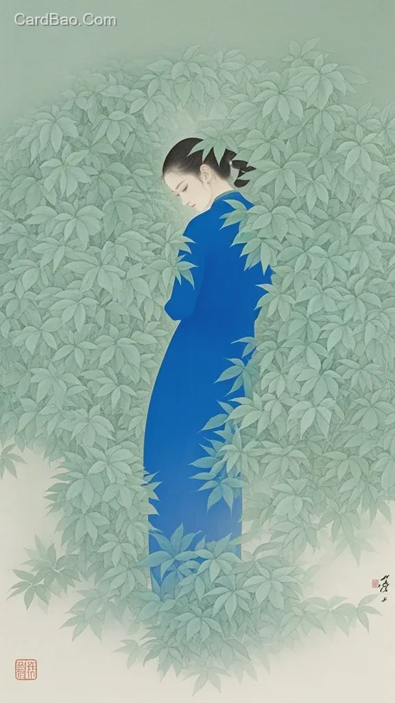 抽象插画,新中式,水墨风,以密集的淡绿色叶片为主视觉元素,叶片纹理清晰,富有韵律,叶片边缘渐变模糊空间,虚实,层层叠叠,叶片间的空隙处,有一蓝色的美女轮廓简洁。整体色调清新淡雅,清淡的绿色很宁静,营造出静谧悠远的氛围。空灵、梦幻、禅意,大面积留白,大师作品。