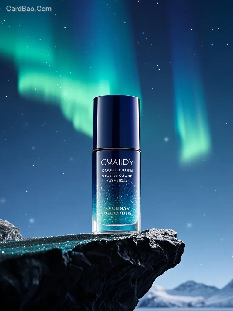 高级感海报拍摄,主体是一瓶暗蓝色渐变的眼霜,开盖,膏体是青色带闪片的啫喱质地,深蓝色的瓶盖,站在悬崖边上,暗蓝色天空背景下的蓝色星光和极光,绚烂多彩,超强质感,营造出梦幻的氛围,绚烂发光,超强品质感,亮暗对比强烈,大牌质感调性,光感通透,背景简洁干净,大面积留白,居中构图,4K,