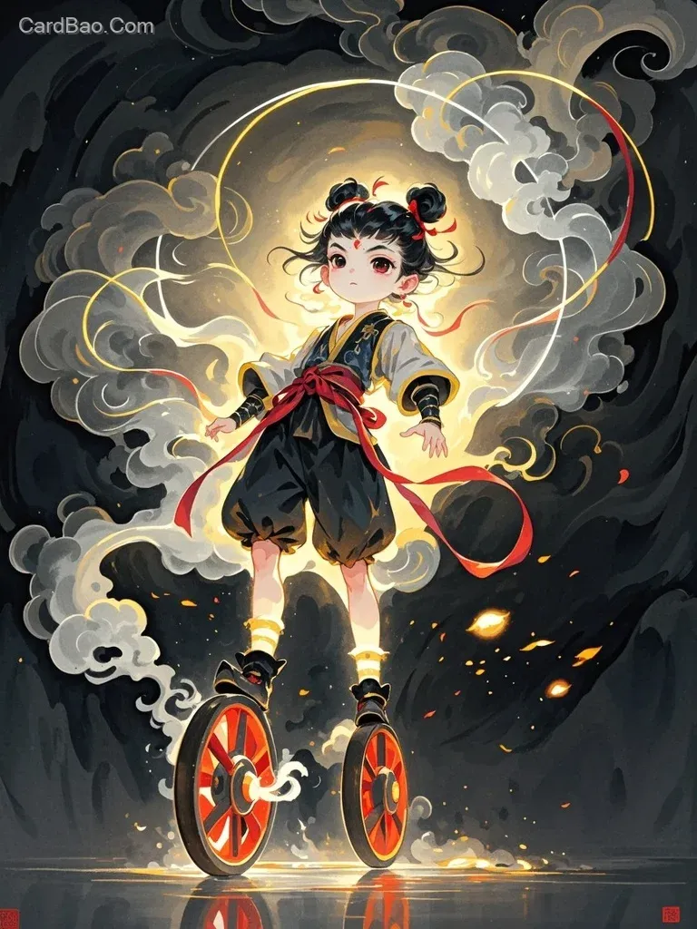 闹海》 中Q版魔童哪吒双脚脚踩风火轮的轮廓,透明,近距离,正面特写,线条如水般柔和自然,意识流,极简,水墨意境,烟雾质感,梦幻,唯美,拖影,禅意,空灵,纯黑背景,大师作品,32K分辨率