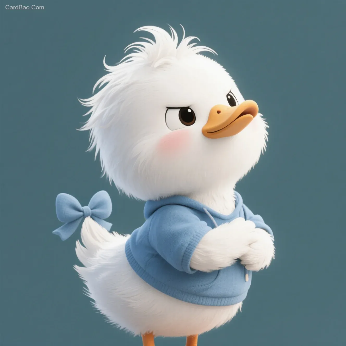 A cute anthropomorphic little white duckling with a big head and a small body, fluffy and messy hair, wearing blue casual clothes, its tail raised and tied with a bow, 3D, ink-wash style, solid color background, looking up with a tilted head in anger, arms crossed.