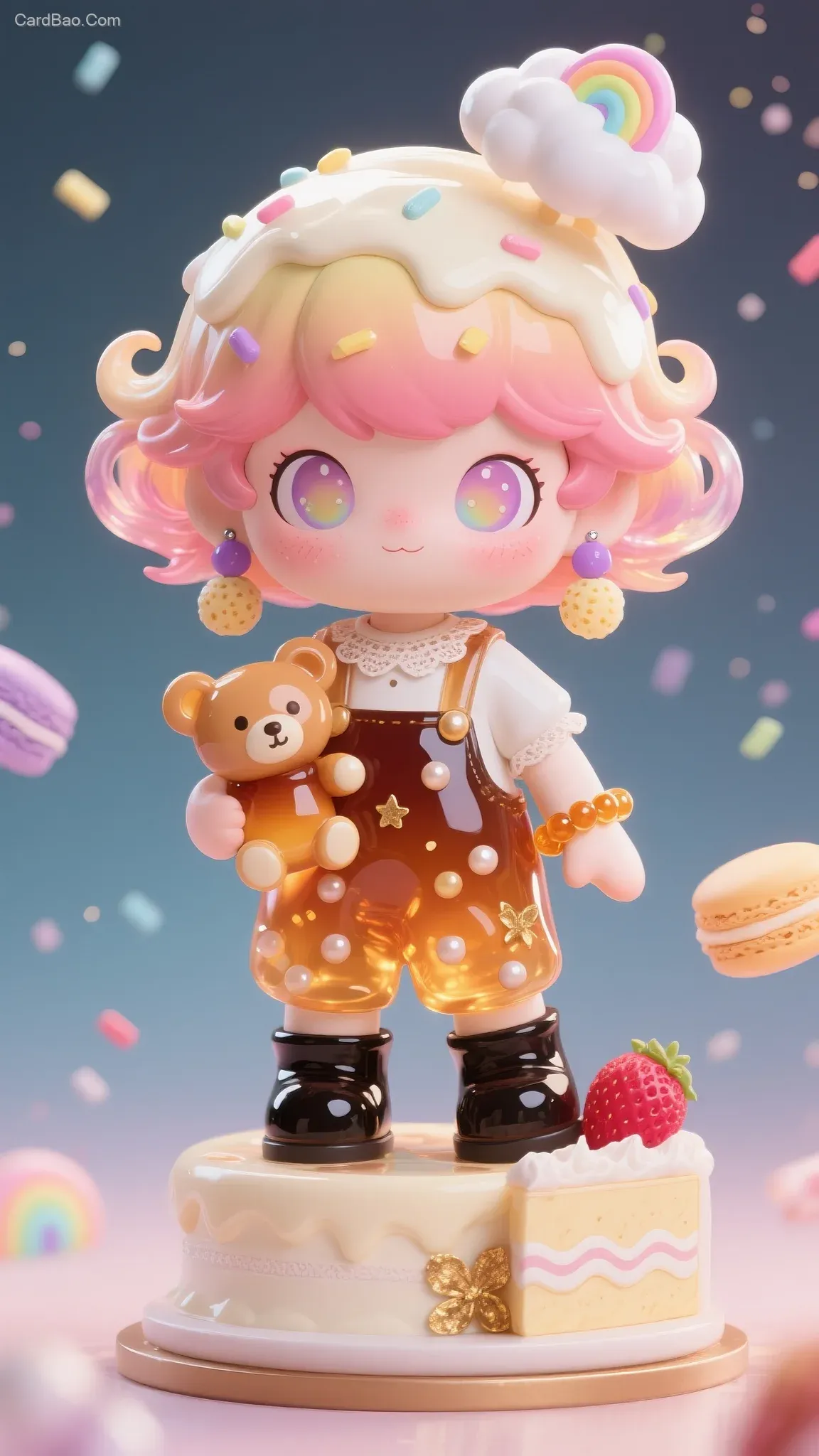 The character wears overalls with a mango pomelo sago jelly texture (featuring suspended fruit bits for a 3D effect and a glossy coconut milk glaze reflection). On its feet are short boots made of brown sugar bubble tea jelly (with translucent pearls encased in amber syrup). It holds a caramel pudding teddy bear (with a surface featuring torched amber spots) and wears a suspended sugar cloud hair accessory (with a fluffy, sugar-threaded effect).