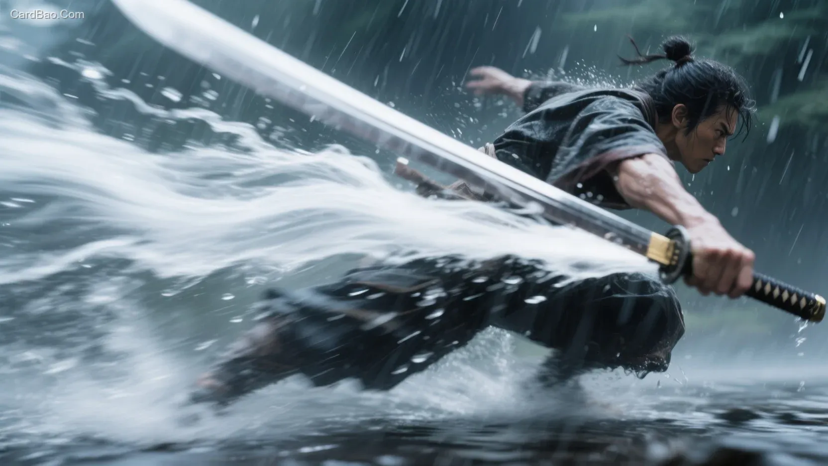 剑士身体前倾冲刺,身体突破音障,白色气流随着身体向后吹拂,拿着武士刀的左手被动态模糊完全覆盖,武士刀拉出长长的流水型残影,从画面远景延伸到近景特写,武士刀残影大量动态模糊,径向模糊,边缘模糊,斩开雨滴,身体突破雨水,冲击性动作,划开屏幕的一刀斩,明显分界线,大量紧贴人物动作的锐利速度线。透视动态构图,运动流线构图。