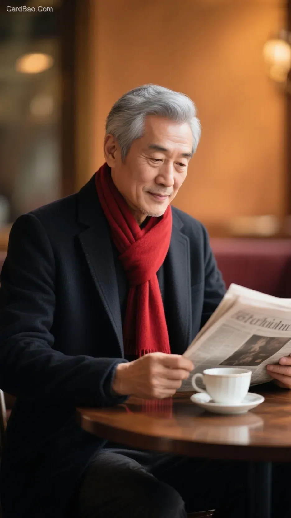 Middle-aged to elderly man with silver-gray hair, wearing a dark fashionable coat and a red scarf, sitting at a table with a teacup and reading a newspaper. Noble, elegant, handsome, fair and clean skin, medium shot, detailed and exquisite description, master-level composition, 32K high-definition image. High-definition, kind and gentle expression, warm-toned background.