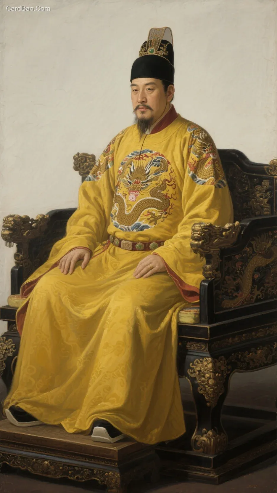 中国古代帝王肖像画风格,中景画面。呈现身着黄色龙袍、头戴黑色冠帽的帝王形象,端坐于装饰华丽的座椅,背景简洁,氛围庄重、威严,充满皇家气势。油画写实风格暗黑