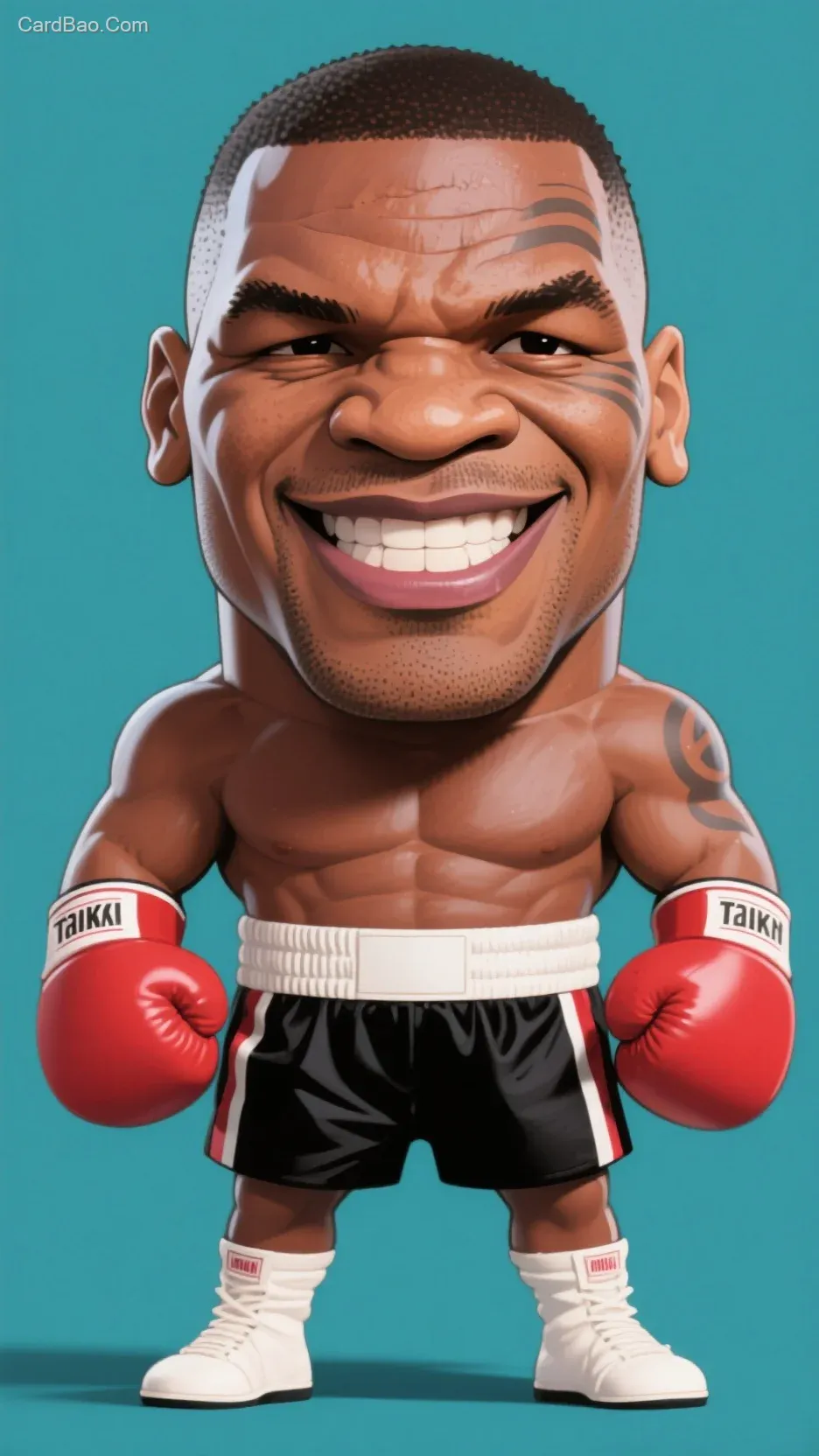 A comical and exaggerated portrait of boxer Tyson, highlighting humorous and quirky characteristics, in a cartoon style with an exaggeratedly large head and an exaggerated, playful expression. Solid color background. Extremely high definition and detailed.