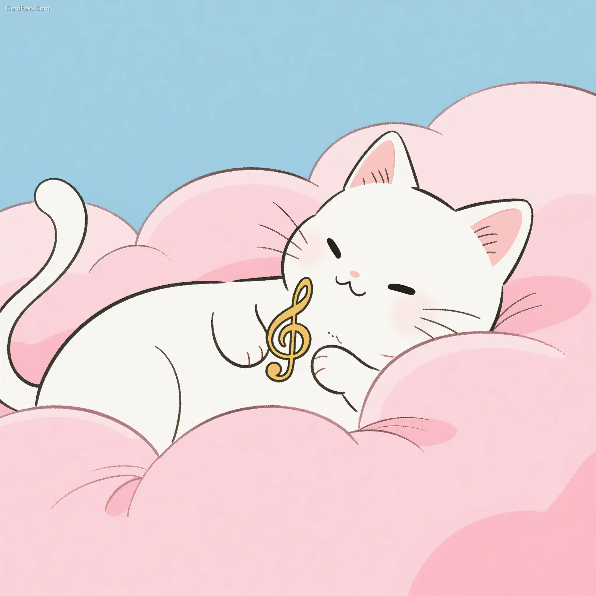疗愈主题的音乐专辑封面,一只白色猫咪躺在粉色云朵上,怀里抱着一个小型的金色音乐符号,背景是淡蓝色的天空,日系漫画风格,特写,温馨治愈,柔和色调,线条简