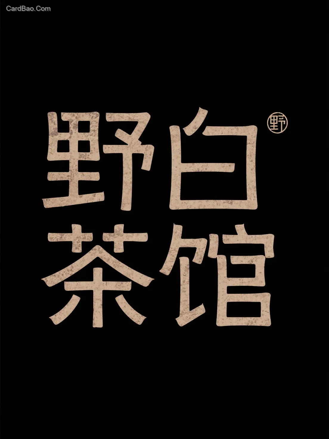 古韵字体“野白茶馆”,采用细长古韵字体,字形方正但是不失书法韵味,具有复古风格,笔画粗壮有力,厚重,使用简约无衬线大写黑体,字体边缘微微粗糙,模拟古代印花或者铜刻效果,笔画转折处保留传统书法特征,纯黑背景#000