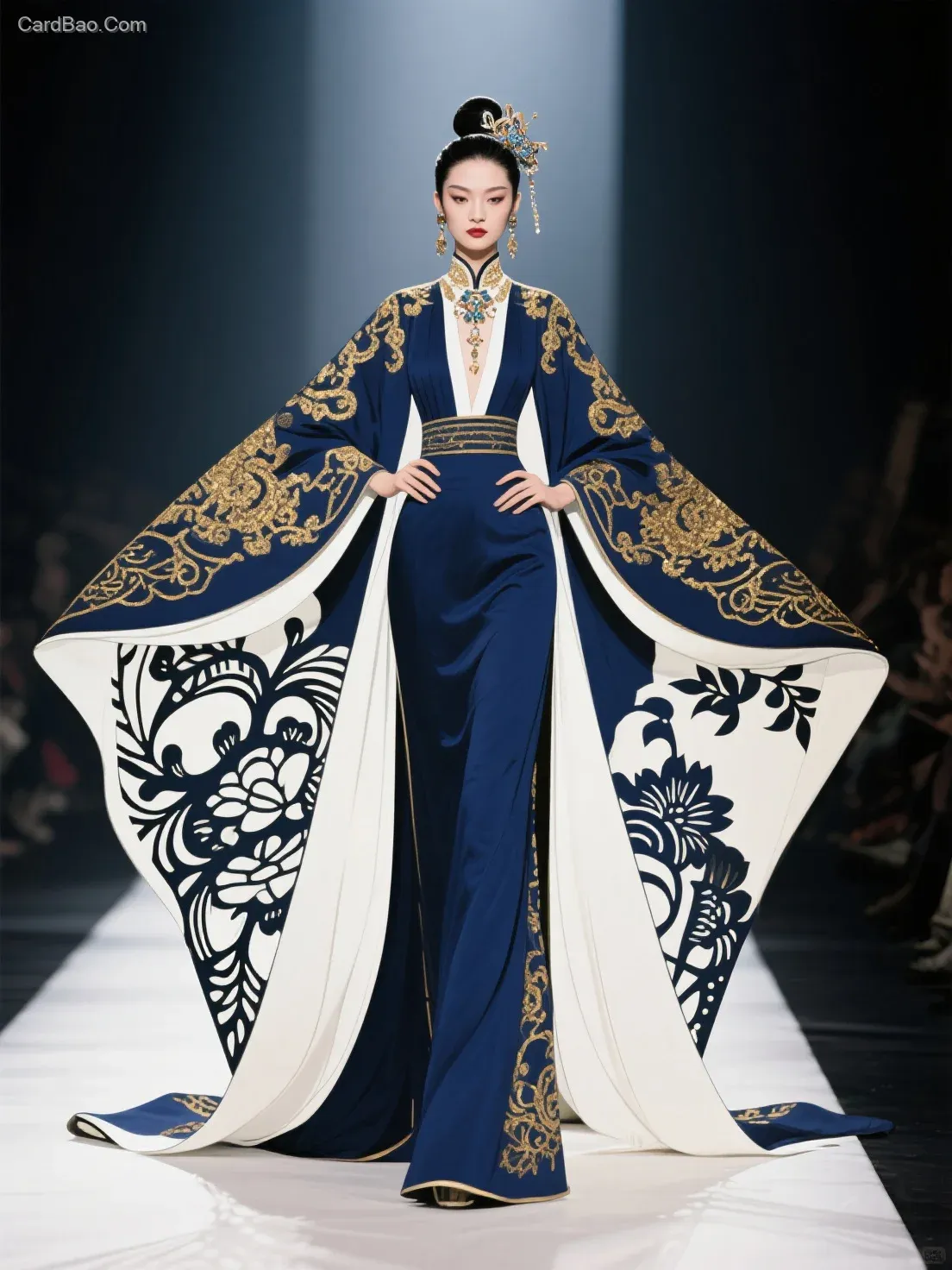 皮影戏艺术,人像,调性,怀旧,朦胧美学,东方模特穿着剪纸服装,中西结合长礼服,夸张的大拖尾,深蓝纯白撞色披风,手绘效果图,立体裁剪,廓形宽松,金线刺绣,色彩浓郁,高饱和度,对比强烈,高级设计感,模特正面展示,国际艺术服装展,极具艺术的现代设计构图形式,意大利人物摄影,大师作品。全身照,杰作,获奖作品,衣服上面是传统剪纸工艺图案,给人恍惚又宁静的感觉,光影 情绪,情绪 氛围,明暗对比,弥散渐变,高级感,优雅,拖地长度,古典时尚,东方美学,现代T台场景,深色与浅色背景搭配。神秘深邃。时尚舞台,时尚配饰精巧点缀,带着中式古韵与现代时尚的碰撞。在时尚摄影的镜头下,整体造型尽显独特魅力 。