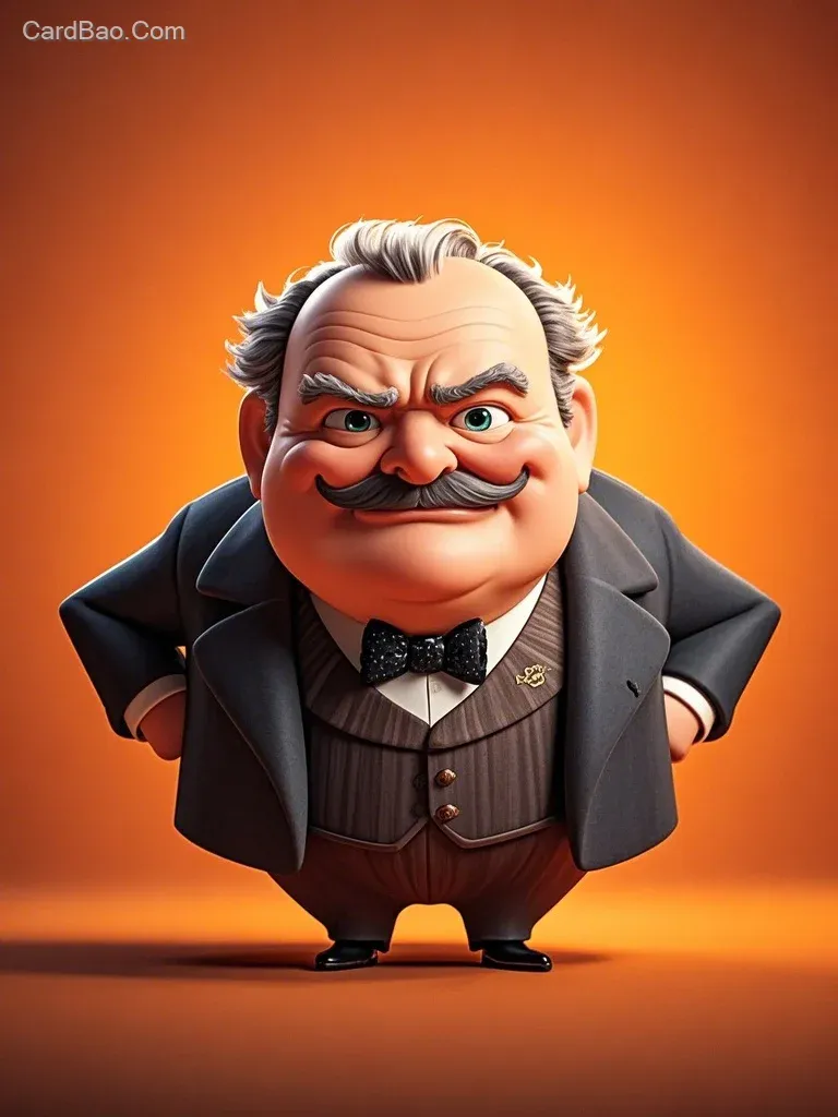 丘吉尔的卡通图像,抽象,夸张,高清细节,橙色背景。迪士尼梦工厂风格。 3D卡通,伦勃朗光