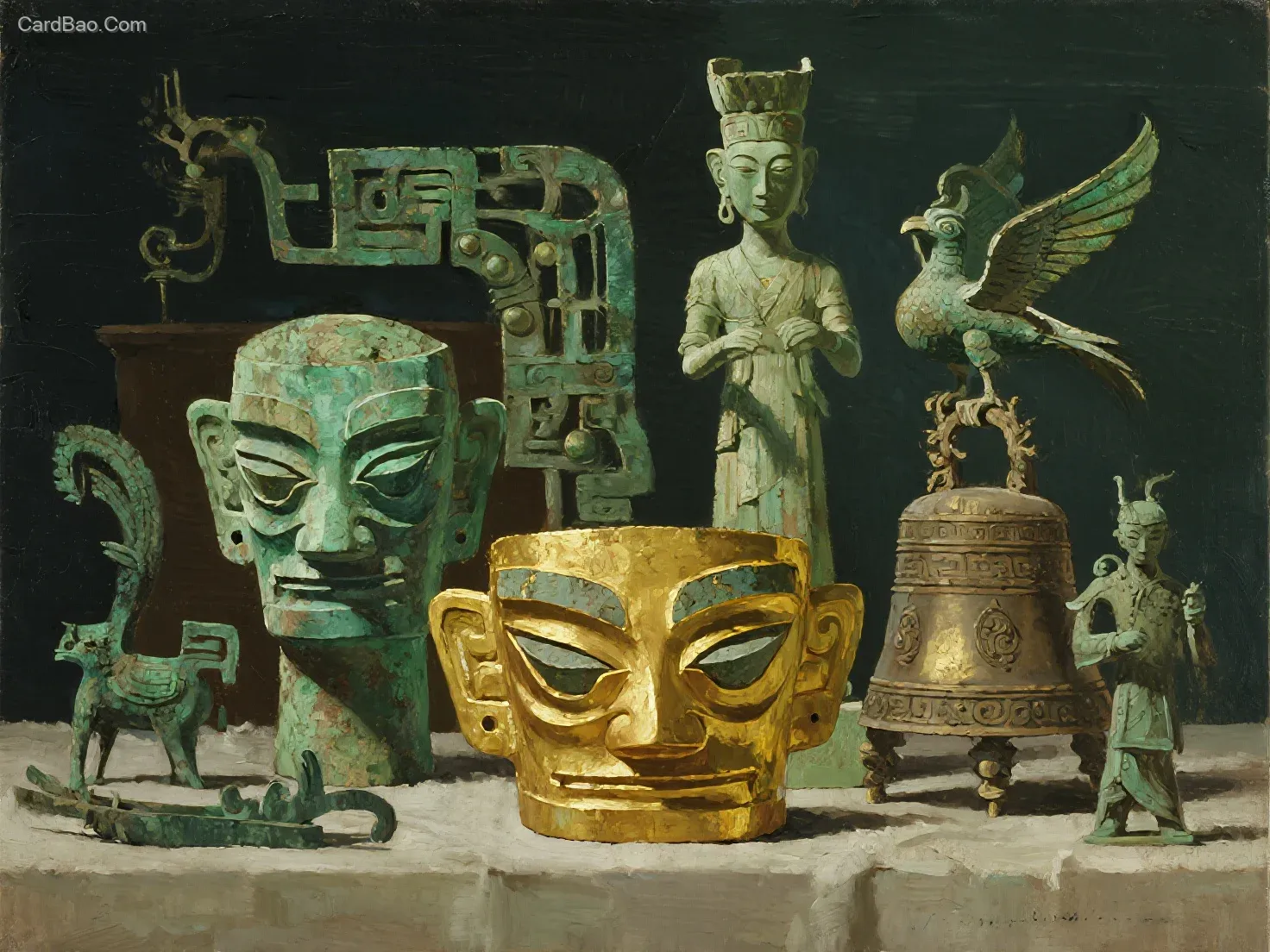 Create an abstract illustration of the Sanxingdui artifacts, including bronze statues, masks, the divine tree with bronze birds, and more. Render the unearthed relics from the Sanxingdui site in an oil painting style, primarily using bronze green and golden hues. Arrange the artifacts in a staggered composition across the canvas, featuring elements such as the bronze bird head, bronze bells, the towering bronze standing figure, bronze masks, and the bronze divine tree.