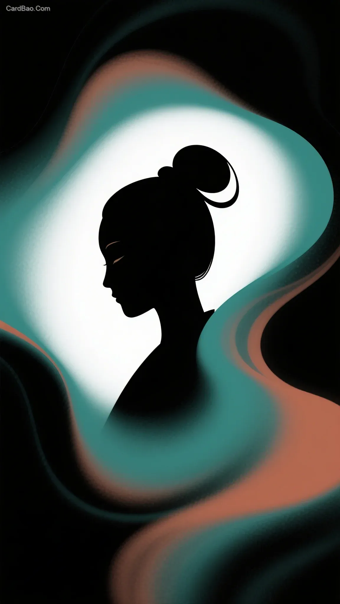 Neo-Chinese silhouette portrait nested in minimalist fluid halos, with motion blur simulating the flow of consciousness. An abyssal black base accentuates the dual-color contrast of peacock green and ochre. Traditional hair buns are deconstructed into minimalist fluid forms, with dissolved boundaries between reality and illusion. Features a silkscreen print texture, surrounded by cel-shaded animation-style minimalist lighting. Minimalist, sophisticated, and dreamcore.