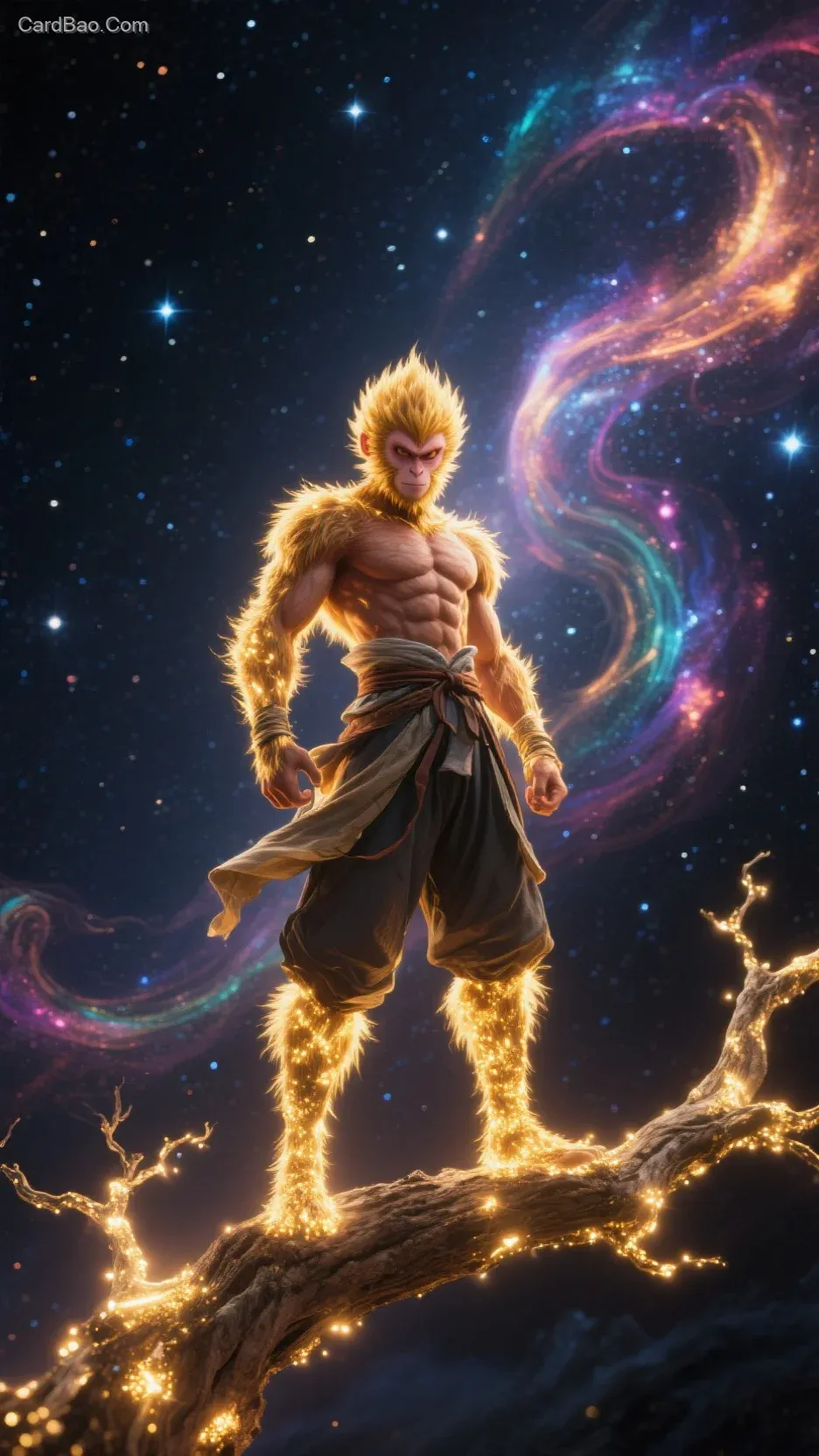 Sun Wukong stands tall and poised on a glowing tree branch. Particles of light emanate from the branch, and his fur glistens with a golden radiance. His muscles are defined and powerful, while his waist-tied attire accentuates his sharp and heroic demeanor. The background is a deep, boundless starry sky, with brilliant stars twinkling and magnificent nebulae intertwining like dreamy ribbons, creating a mysterious and vast atmosphere that perfectly highlights the extraordinary and untamed nature of the Great Sage Equal to Heaven.