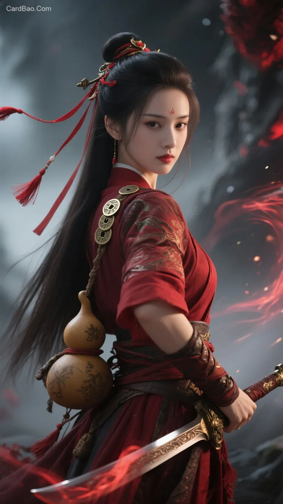 Film photography, out-of-focus effect, strong side lighting, cool color tone, high saturation, high exposure, overexposure, low-key lighting, Rembrandt lighting, strong chiaroscuro, high contrast, fantasy immortal fairy, distinctive facial features, peerless beauty, golden ratio facial structure, demon hunter, whimsical and mischievous, lively and adorable, hime-cut hairstyle, shoulder-length hair, red thread hair accessory, tassels, hairband, playful and cute, holding a gourd, carrying a bronze coin sword on the back, clothing in dark red tones, new national trend attire, strong lens distortion, Unreal Engine 5, emphasis on character abilities with special effects and particle effects, strong sense of perspective, gray and red color scheme, Fauvist style, diffuse gradient, sense of distortion, natural dynamics, tension-filled composition, surrealism. 4K high definition.