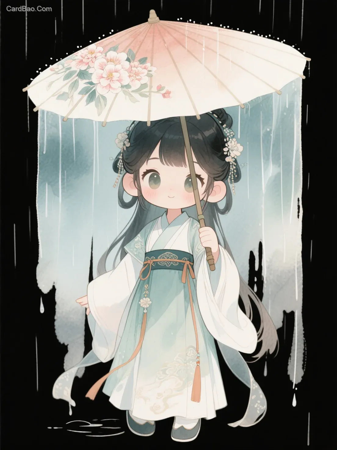 花伞,雨帘从伞下垂下来,古风,光影,动漫,二次元,Q版,水彩水墨,人设,无背景,弥散渐变,精细,精致,高质量,立绘,层次感,朦胧,可爱,全身