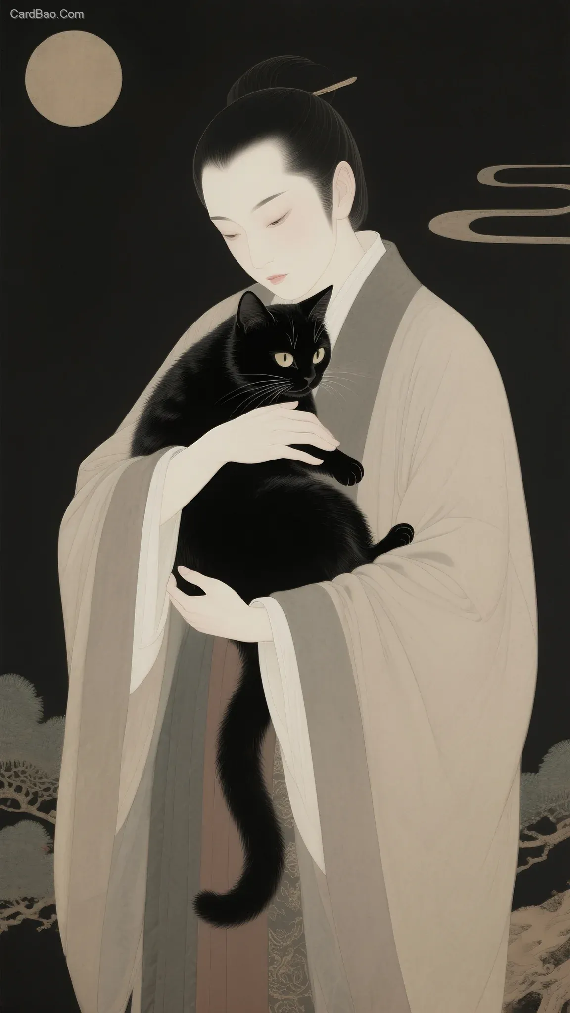 Pioneering artistic experimental stills, cinematic illustration art stills, surrealistic portraits, holding a black cat, Chinese ancient style, Eastern artistic conception, high-aesthetic film stills, trending styles from Behance and other visual platforms, movie stills, Kenya Hara's design aesthetics, Huang Hai's visual communication. Combining Vittorio Storaro's masterful cinematic composition, Donald Judd's minimalist style, and Christopher Nolan's layered directorial storytelling techniques, create creatively composited commercial advertising film stills with high saturation, striking impact, exquisite details, strong brand appeal, and rich narrative depth.